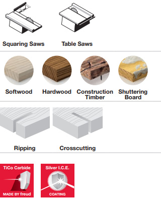 Technical information: Saw blades suitable for ripping and crosscutting. Optimised tooth shape to cut also construct wood with nails or metal clips.